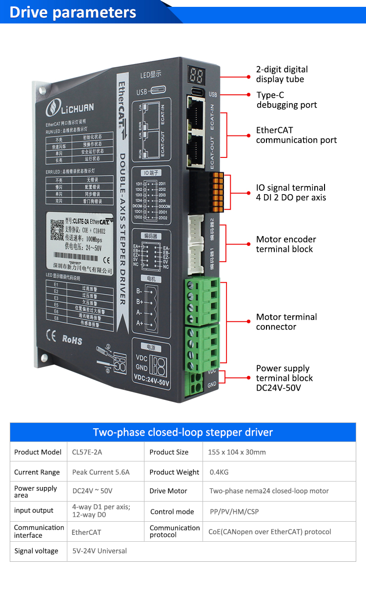 EtherCAT 2Phase Nema24 4-осевой комплект драйверов шагового двигателя постоянного тока с замкнутым контуромНовые продукты EtherCAT 2Phase Nema24 2-осевой комплект драйверов шагового двигателя постоянного тока с замкнутым контуром, изготовленный в Китае с CE/ROHS от LICHUAN®. Наша фабрика является известным производителем и поставщиком комплектов драйверов шаговых двигателей EtherCAT 2Phase Nema24 2-Axis DC с замкнутым контуром в Китае. Наш продукт отличается высоким качеством/долговечностью/стабильностью работы и низкой ценой. И мы предоставляем индивидуальные услуги.